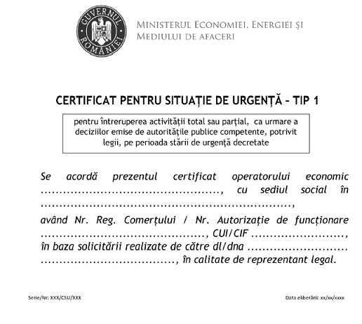 Ministerul Economiei, Energiei şi Mediului de Afaceri urmeaza sa eliberează certificatul de situaţii de urgenţă conform metodologiei aprobate printr-un ordin ce trebuie sa se adopte.