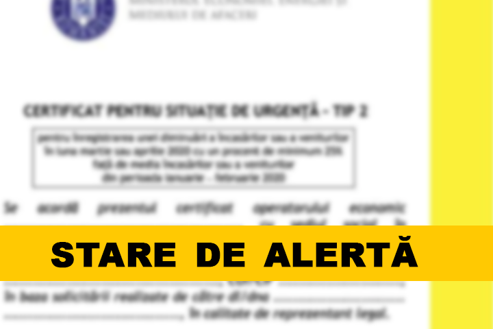 • TIP 2 (GALBEN) – eliberat pentru solicitanţii care au înregistrat diminurea încasărilor în luna martie 2020 cu un procent de minimum 25% faţă de media încasărilor din perioada ianuarie-februarie 2020.